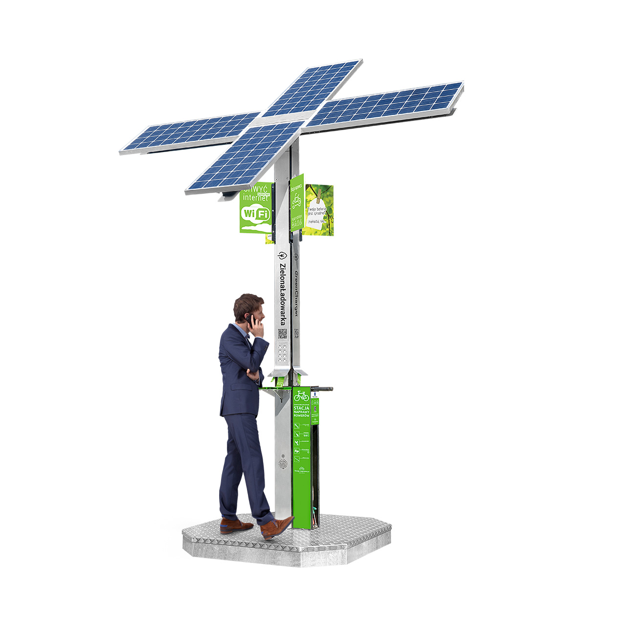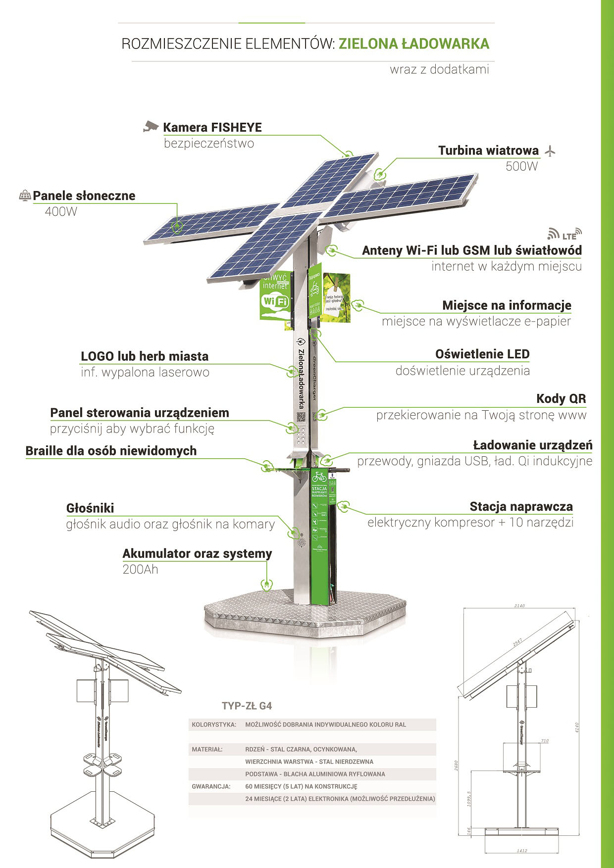 Zielona Ładowarka Prestige została stworzona z myślą o bezpieczeństwie i wygodzie użytkowania. Całe urządzenie zostało wykonane z wytrzymałej 3mm stali węglowej, ocynkowanej ogniowo i pomalowanej proszkowo. Urządzenie jest funkcjonalne i nie posiada ostrych zakończeń. Z urządzenia, dzięki przemyślanej konstrukcji mogą korzystać nie tylko dorośli i młodzież, ale również dzieci i seniorzy.